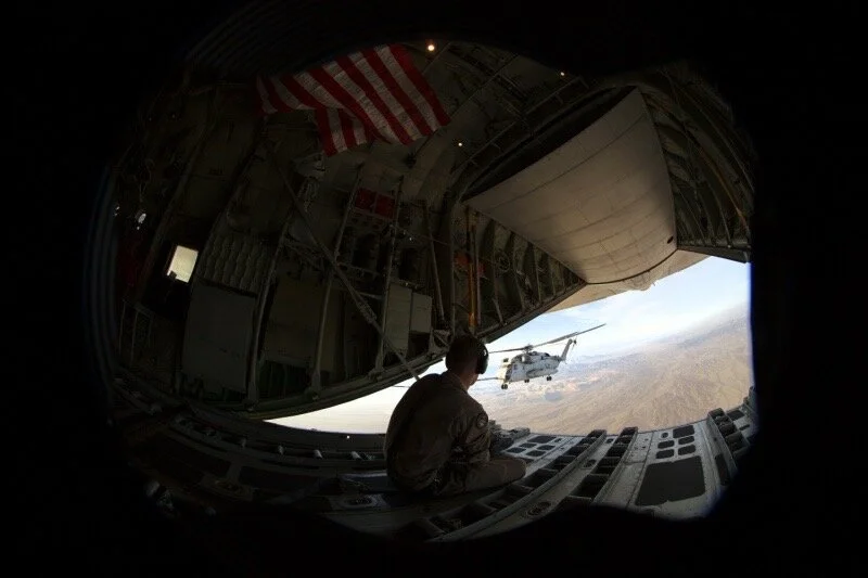 Cpl. Dylan Frank, left, and Cpl. Reynaldo Garcia, right, crew masters with Marine Aerial Refueler Transport Squadron (VMGR) 152, ride aboard a U.S. Marine Corps KC-130J Hercules aircraft in support of a high altitude aerial refuel during Weapons and Tactics Instructor (WTI) course 2-19 in Yuma, Arizona, March 27, 2019.